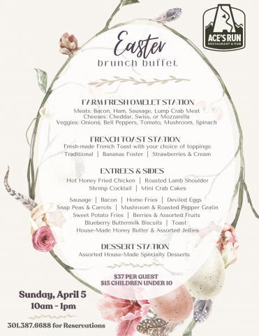 Join us for the Easter Holiday and enjoy a special holiday brunch at Ace's Run Restaurant, conveniently attached to our hotel! The brunch goes from 10 AM to 1 PM and features an omelet station, french toast station, and buffet with entrees and sides. Reservations are recommended!